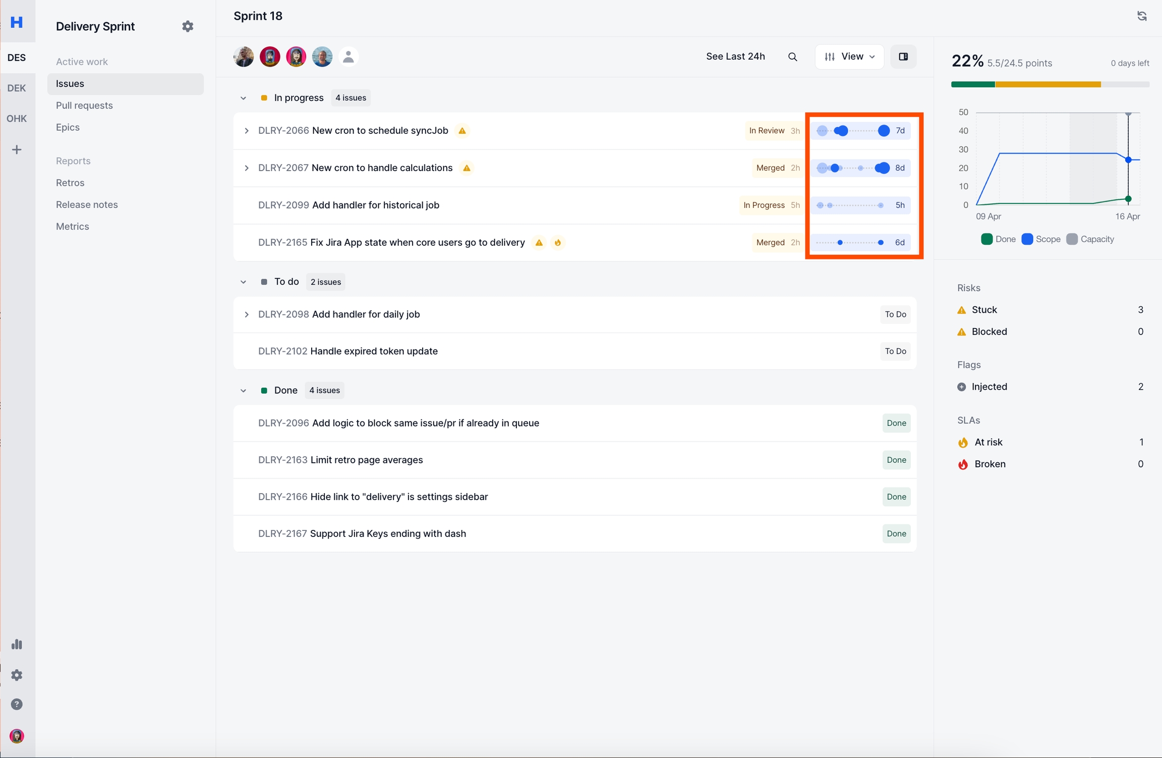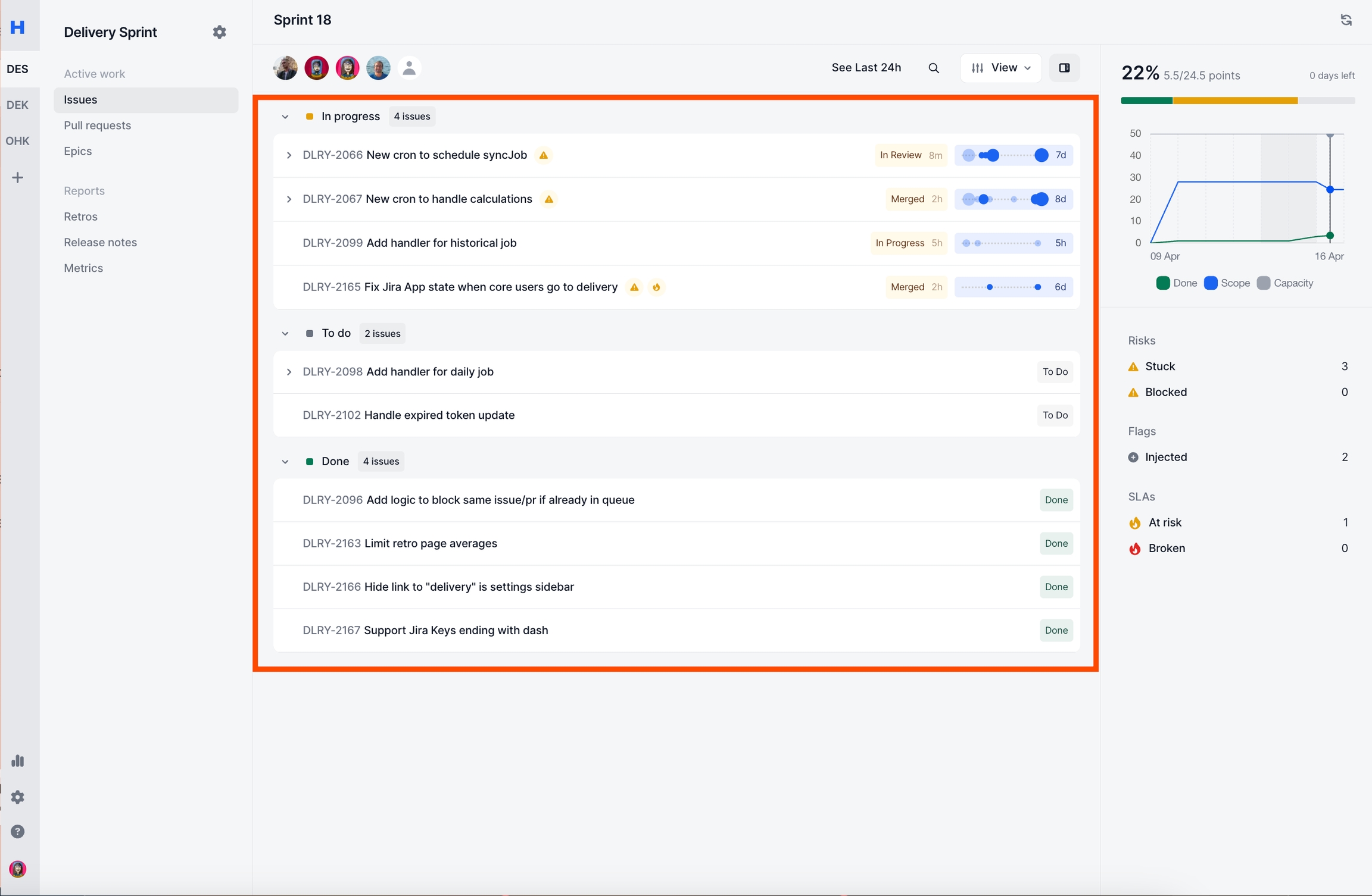 Haystack combines both Jira & Git activity into a single activity bar. The more activities there are the bigger the bubble is.