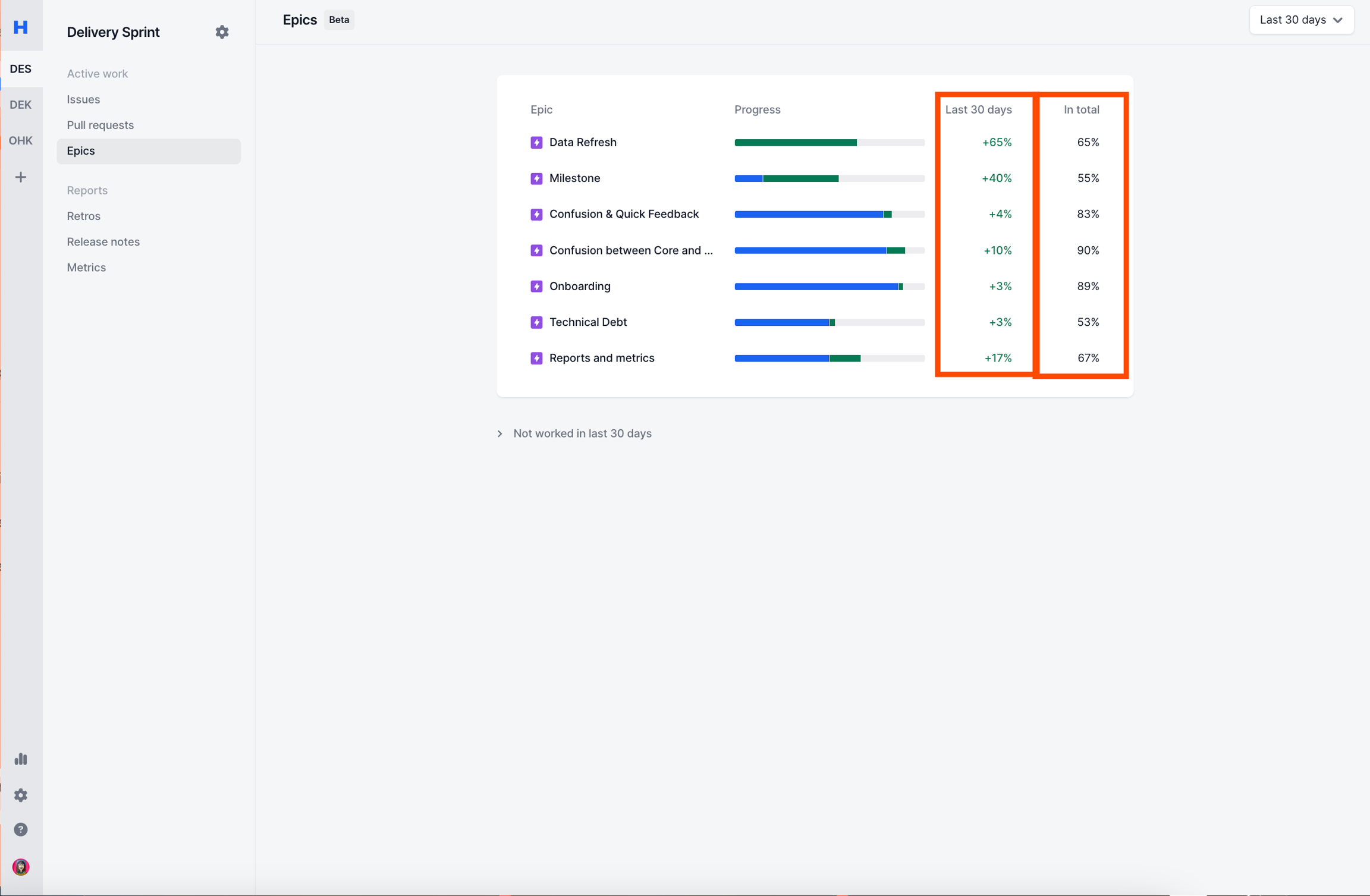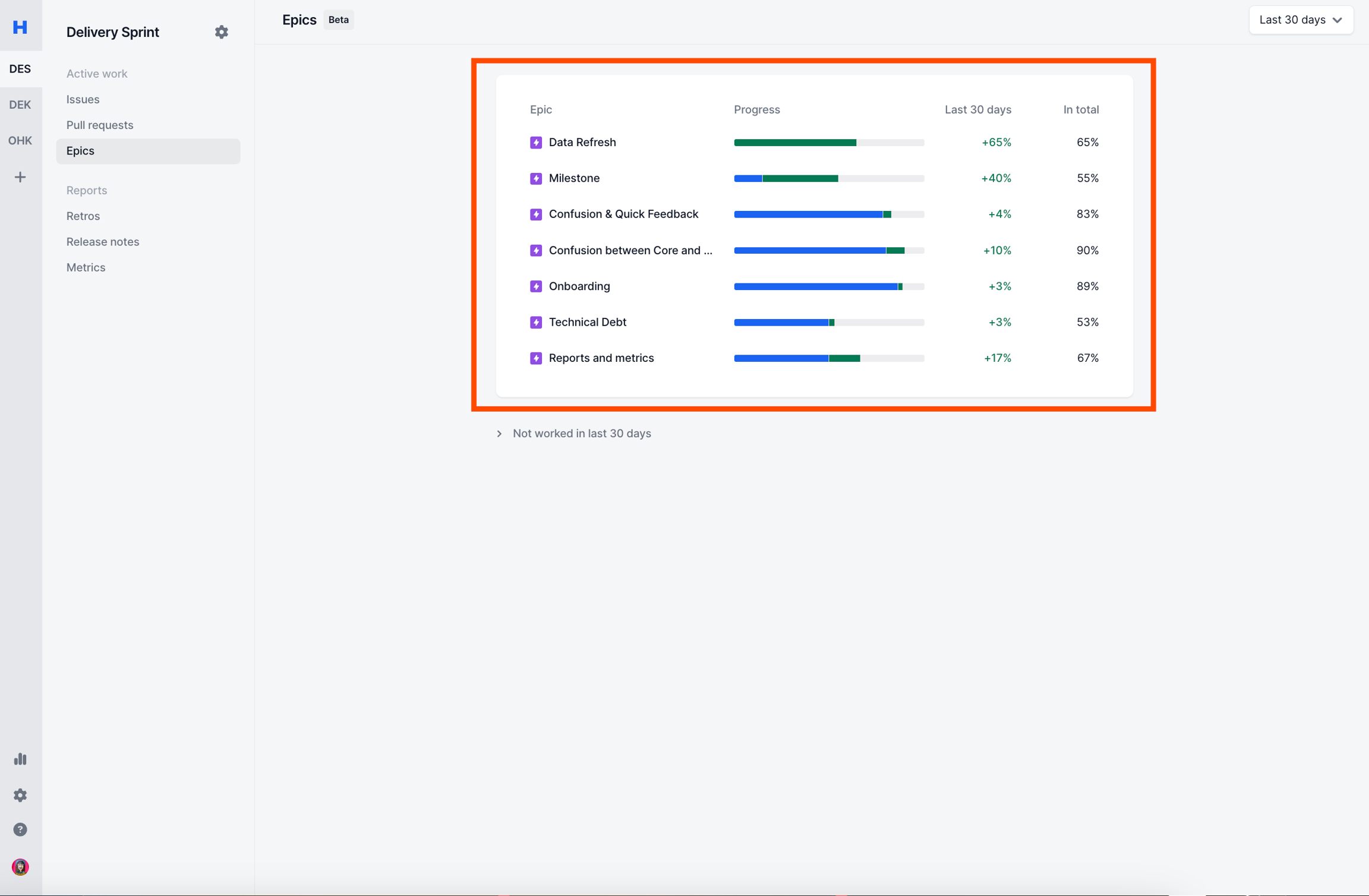 Last 30 days: Depending on the timeframe you selected, will show how much of the issues inside the epic has been moved to