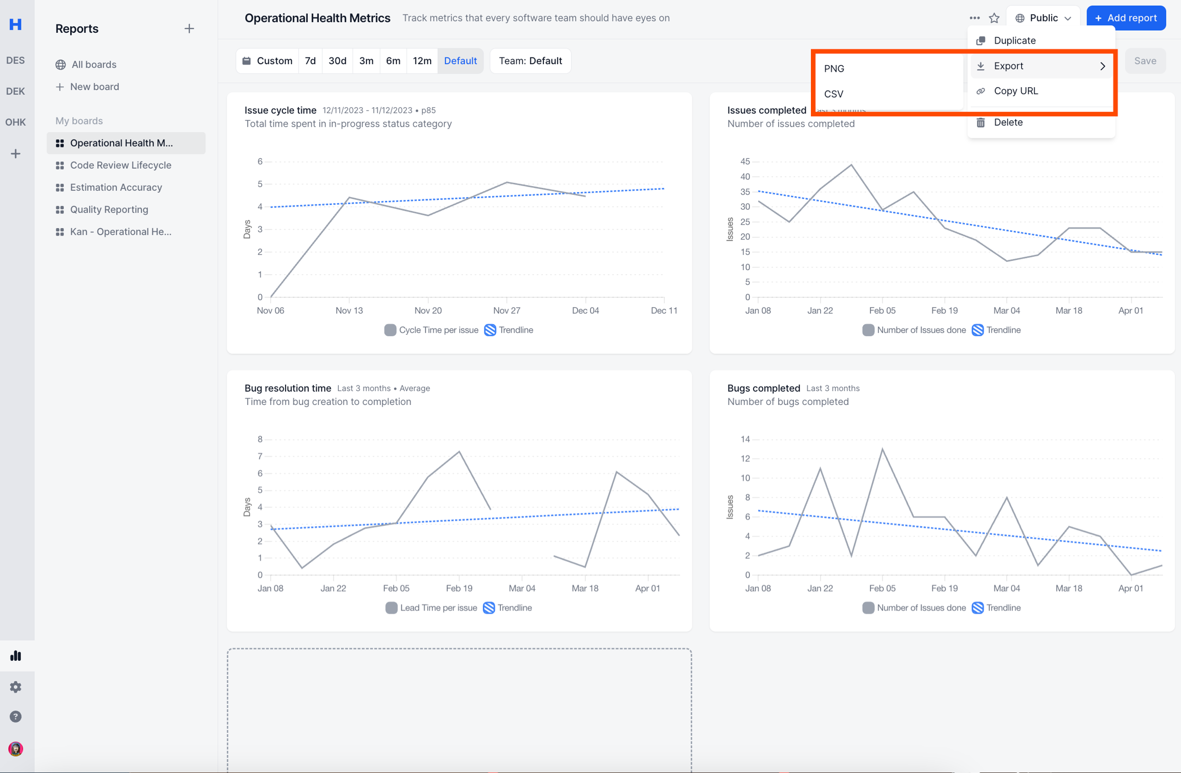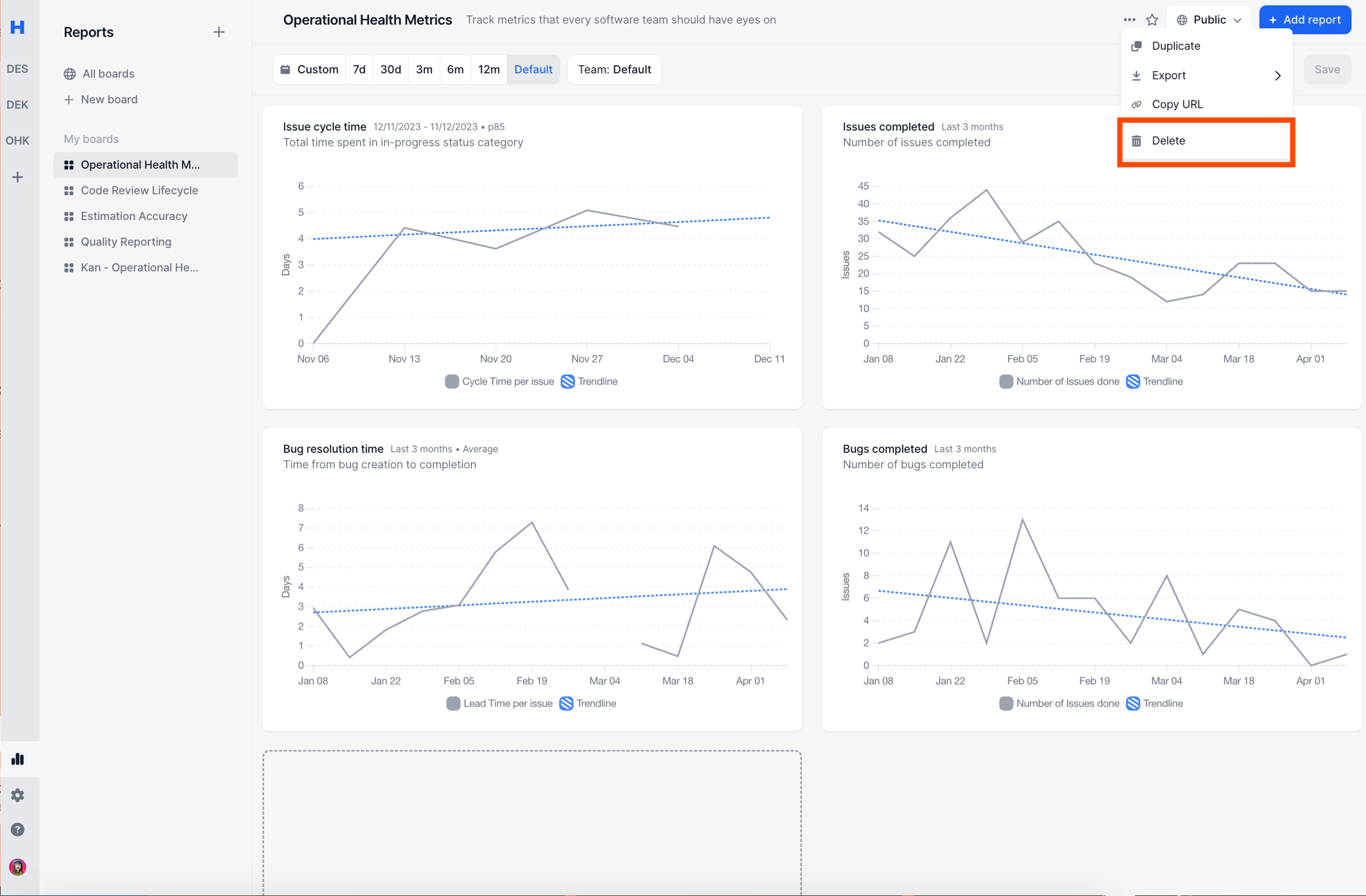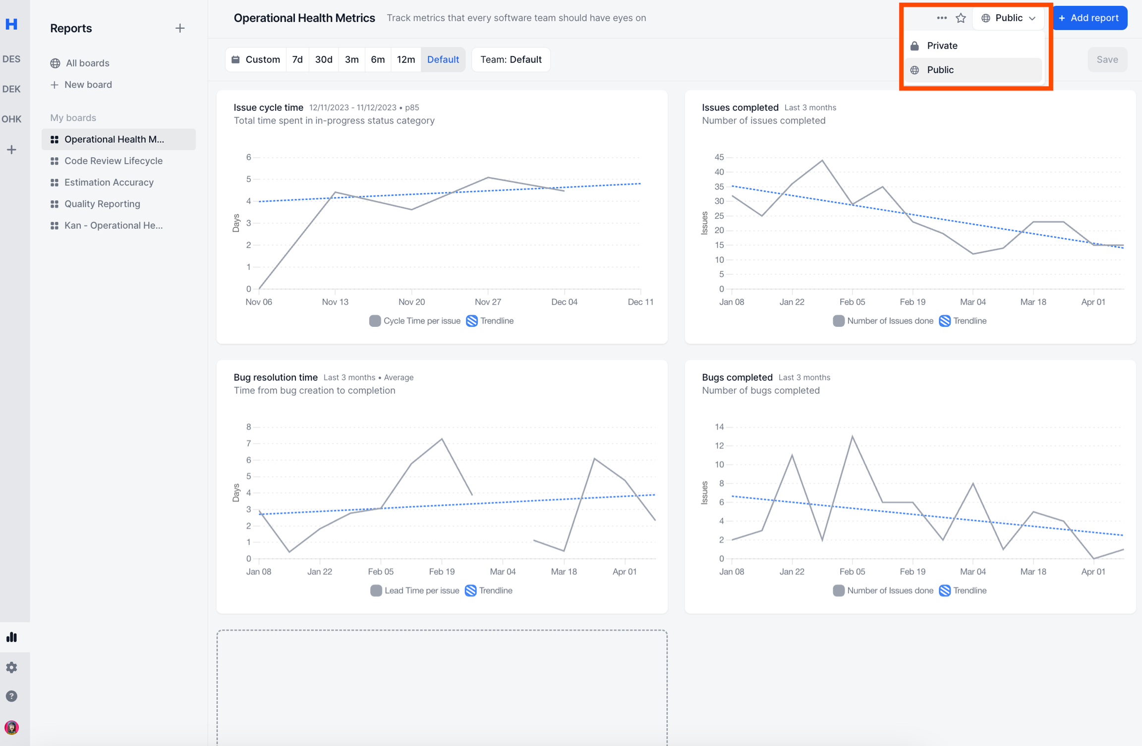 Yes, simply update the filter at the top of any board. This will filter all reports on that board. You can additionally save your filter if you’d like to change the board’s default filters.