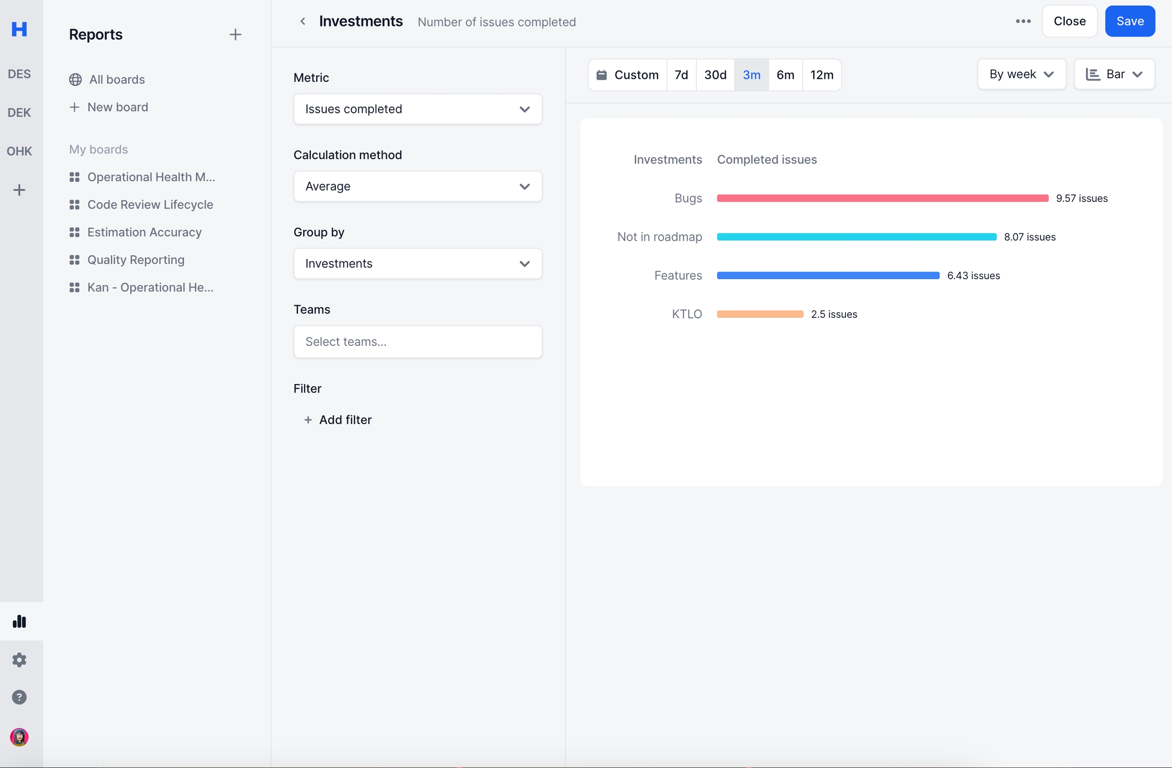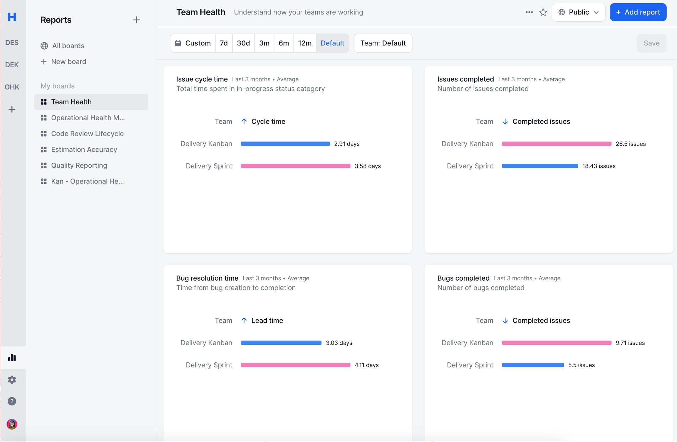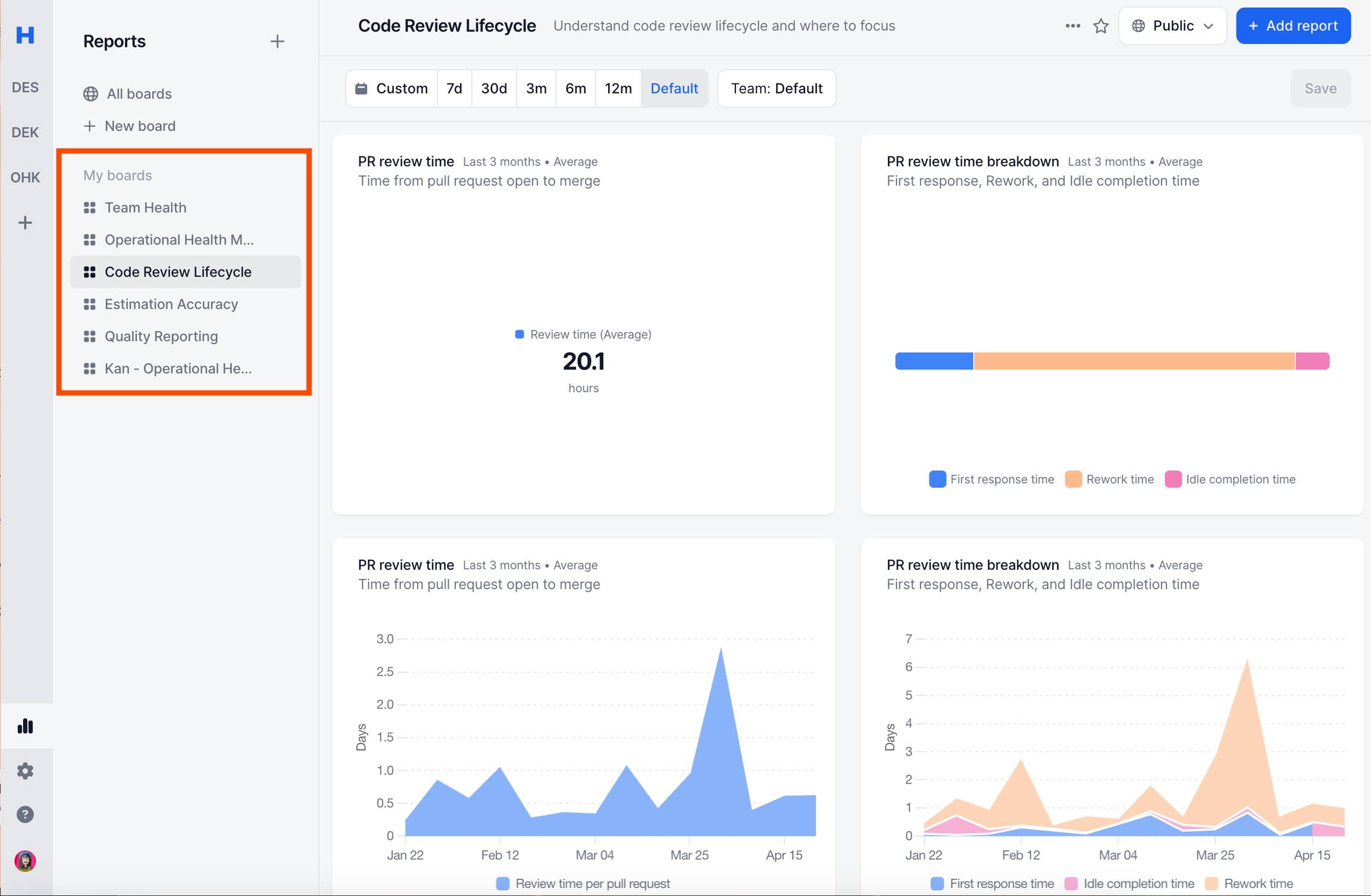Create multiple boards each allowing you to debug one part of your organization from pull request health to bug dashboard.