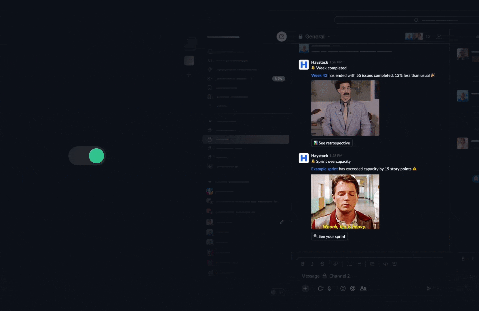 Haystack’s MS Teams integration sends real-time alerts for blockers, progress, risks, and SLAs. Alerts include issue status, bug SLA risks, PR link issues, sprint overcapacity, mid-sprint reviews, cycle completions, release notes, and epic completions.\