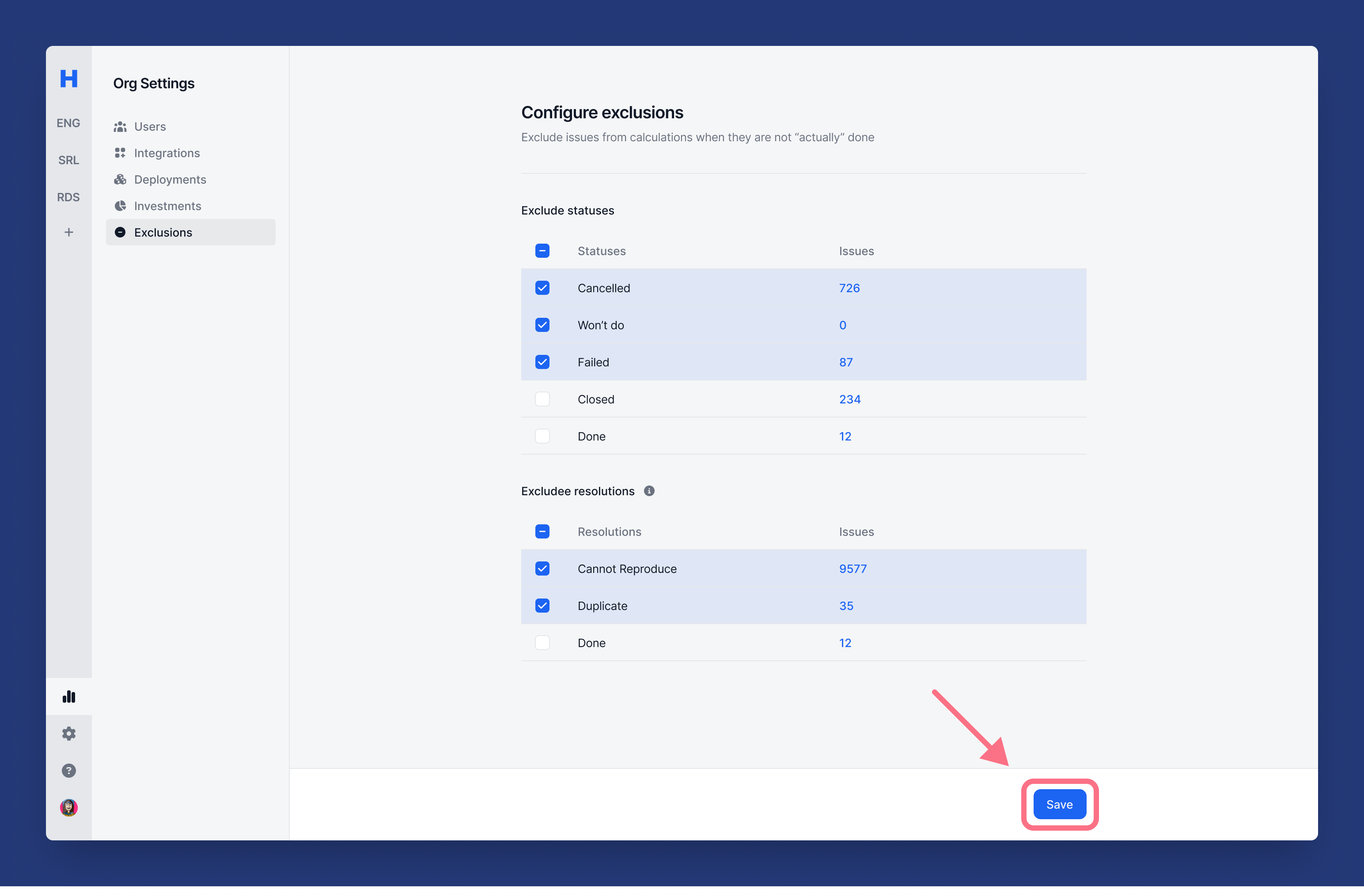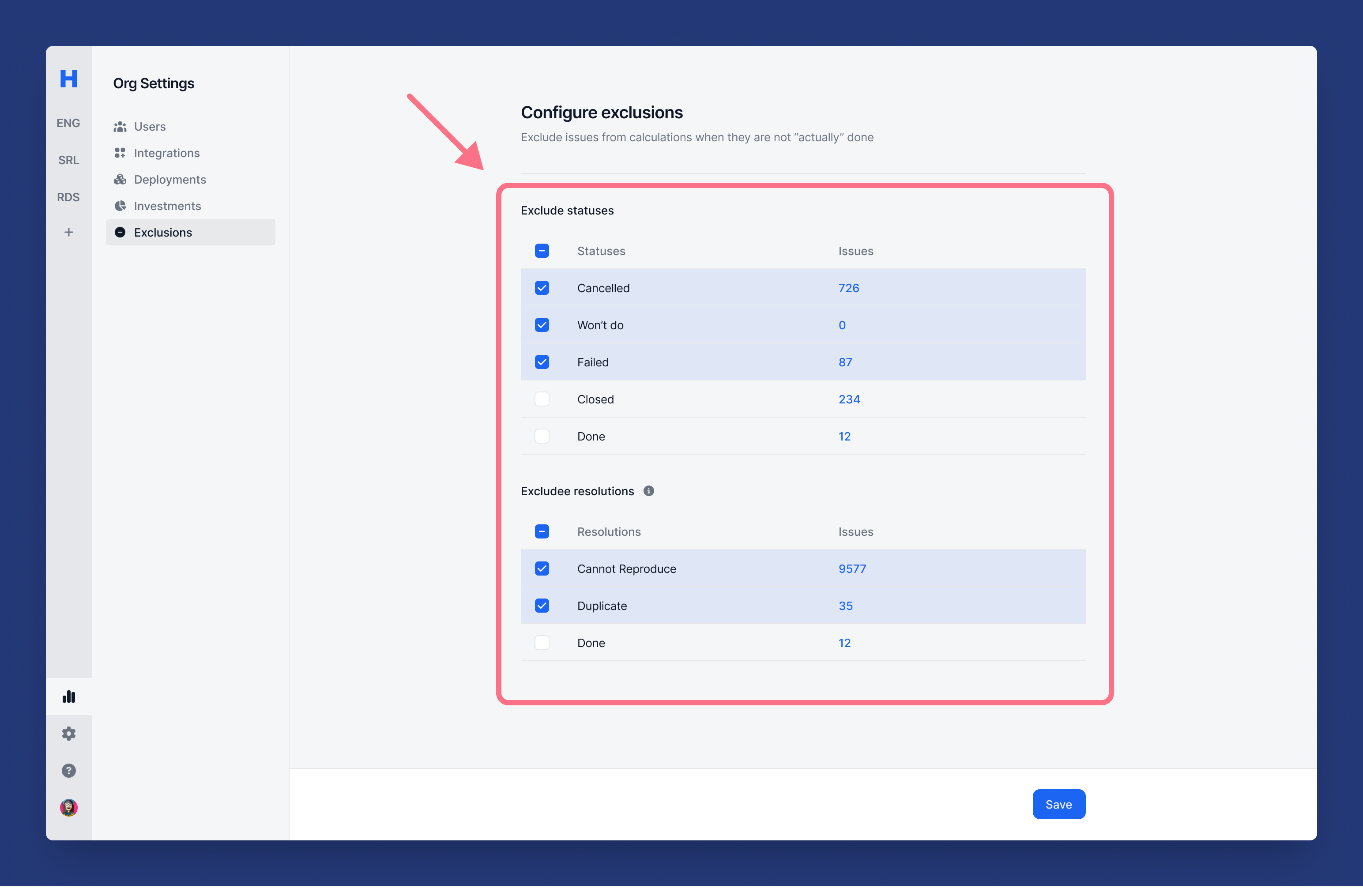 3. Select statuses and resolutions that you want to exclude