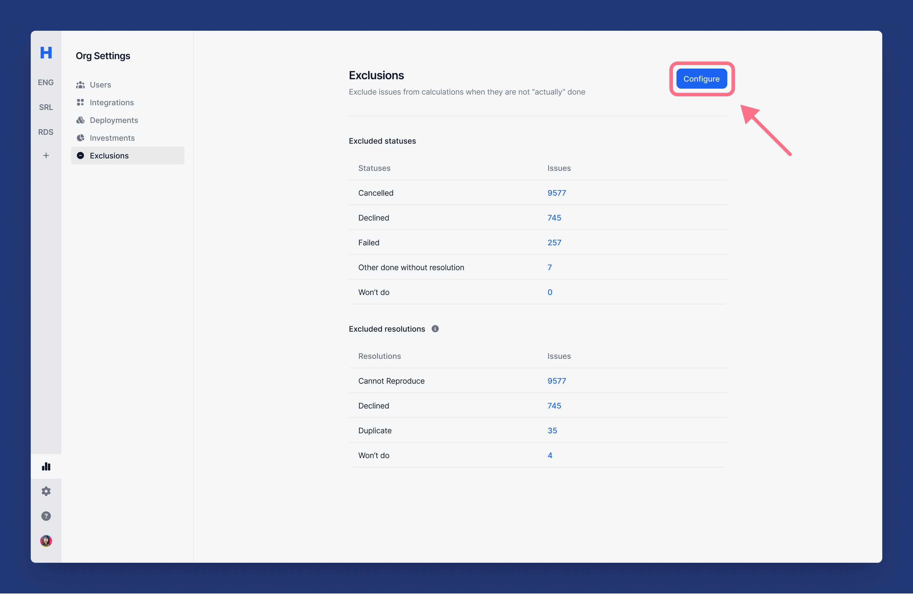 Exclusions help you improve your data accuracy by excluding issues from calculations that were canceled, not completed, deprecated, etc.