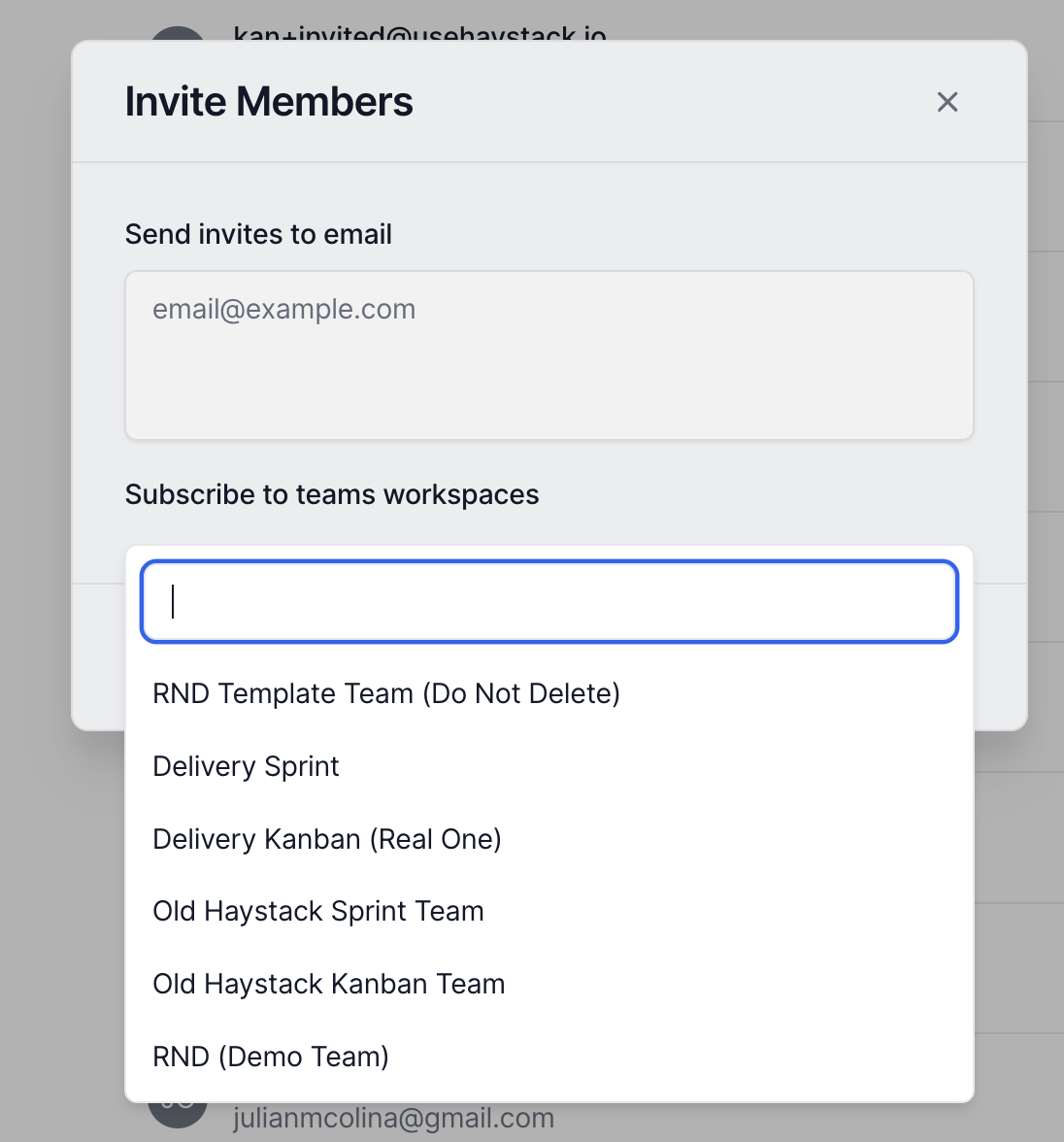 Type the list of emails of members you'd like to invite & select the Haystack team you'd like them to be automatically added to